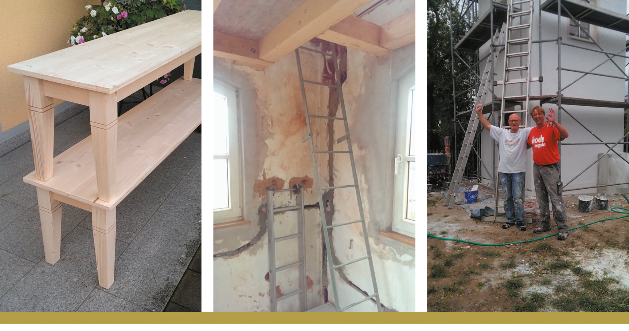Jetzt noch streichen und die Außenfassade ist fertig. Für die Fassade hatten wir uns für ein weiß mit leichtem Grauton und für die Bündchen und den Sockel für das gleiche schilf-grün wie die Eingangstür entschieden. In einer Gemeinschafts aktion mit Anton Maier und Stefan Sket wurde diese Arbeit innerhalb 2 Tagen erledigt, damit dann endlich das Gerüst am 12. August wieder abgebaut werden konnte.