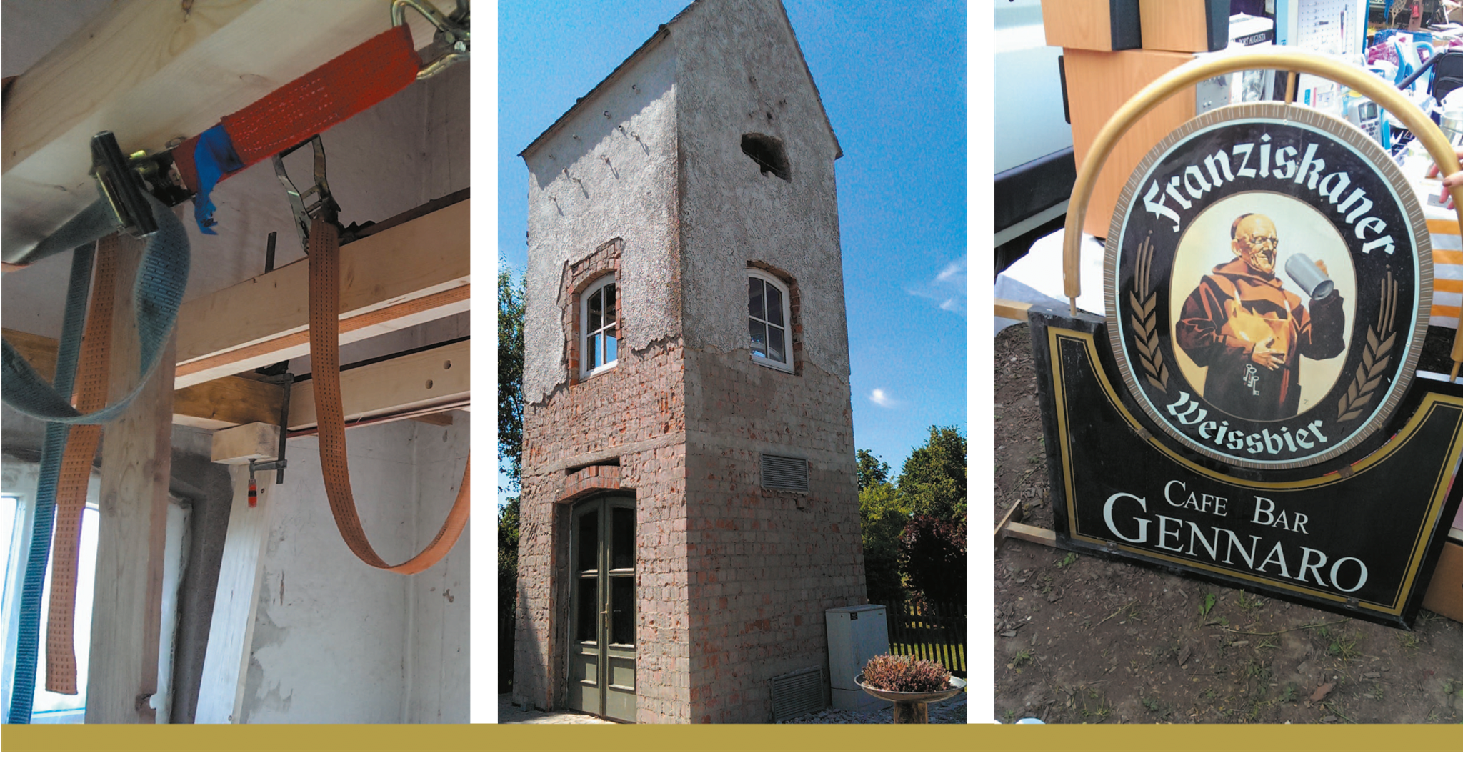 Ein altes Werbeschild, dass wir auf dem Flohmarkt entdeckt hatten, musste geändert werden. Ursprünglich war darauf ein Hinweis auf ein Café aus Günzburg und im oberen Bereich der Mönch der Franziskaner-Brauerei. Wir wollten darauf das Leipheimer Wappen und natürlich den Schriftzug „Villa Ampere“.