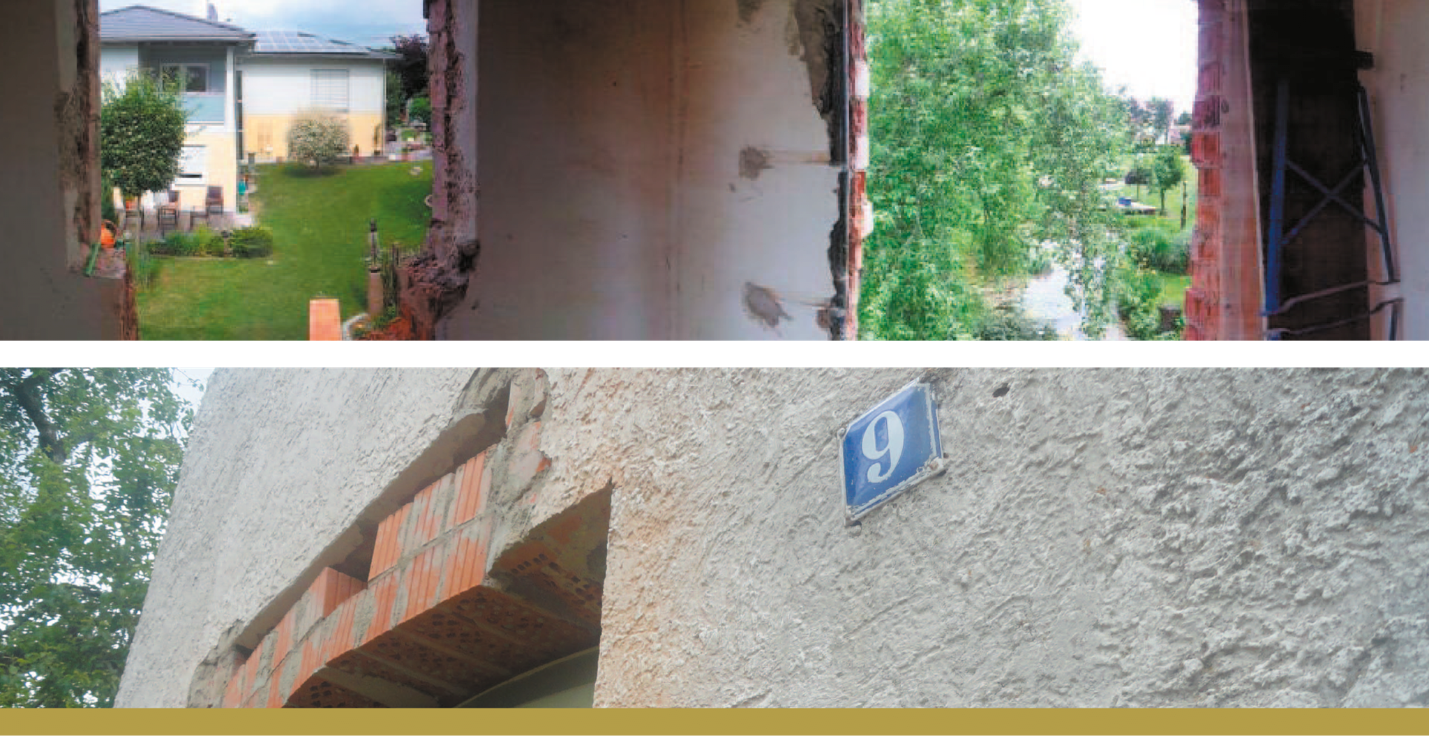 Die Zeit dazwischen wurde dann zum Ausbruch der Fenster im 2. OG genutzt. Dabei kam wieder die solide Bauweise zum Vorschein. Der Ringanker aus festem Beton, mit einer Höhe von 100 cm, war nur äußerst schwer zu durchbrechen. Stückchenweise wurde das Loch für ein Fenster mit dem „Duss“ ausgehämmert. Beim zweiten geplanten Segmentfenster entschieden wir uns dann, ein kleineres schmales rechteckiges Fenster (nur ca. 90 x 35 cm) einzubauen, um uns die Ausbrucharbeiten beim Beton zu sparen.