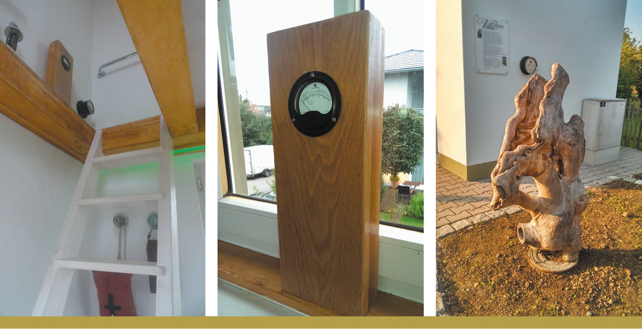 Überraschenderweise kam dann noch ein Anruf von der Bezirksstelle Langenau der EnBW, mit dem Hinweis, dass einige alte Elektroteile für uns bereit stehen. Ein Amperemessgerät verwendeten wir als Deko außen. Ein weiteres Amperemessgerät, 2 alte Stromzähler und 2 Voltmesser wurden innerhalb montiert. Ein alter Widerstandsmesser wurde in einen Eichenholzklotz eingebaut.