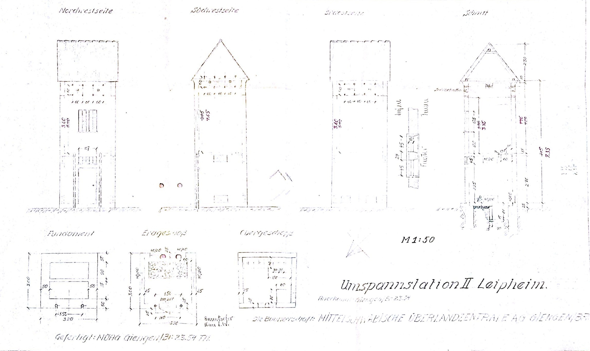 Der damalige zuständige Netzbetreiber MÜAG beschloss dann im Jahr 1954 den Neubau in der heutigen Form. Aus dem uns vorliegenden Original-Bauplan ist die solide Bauweise zu erkennen.